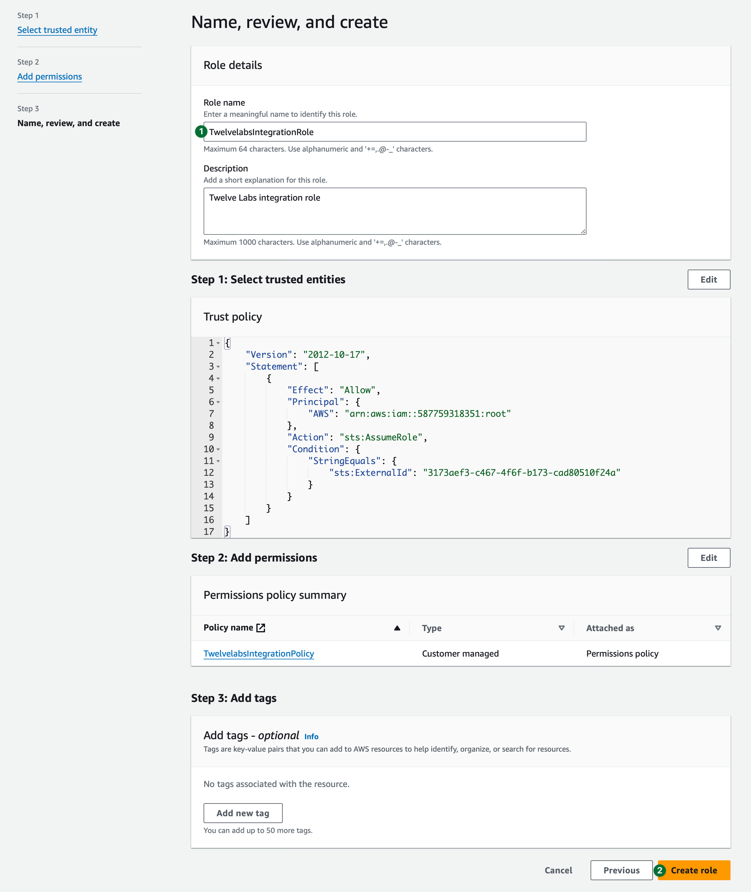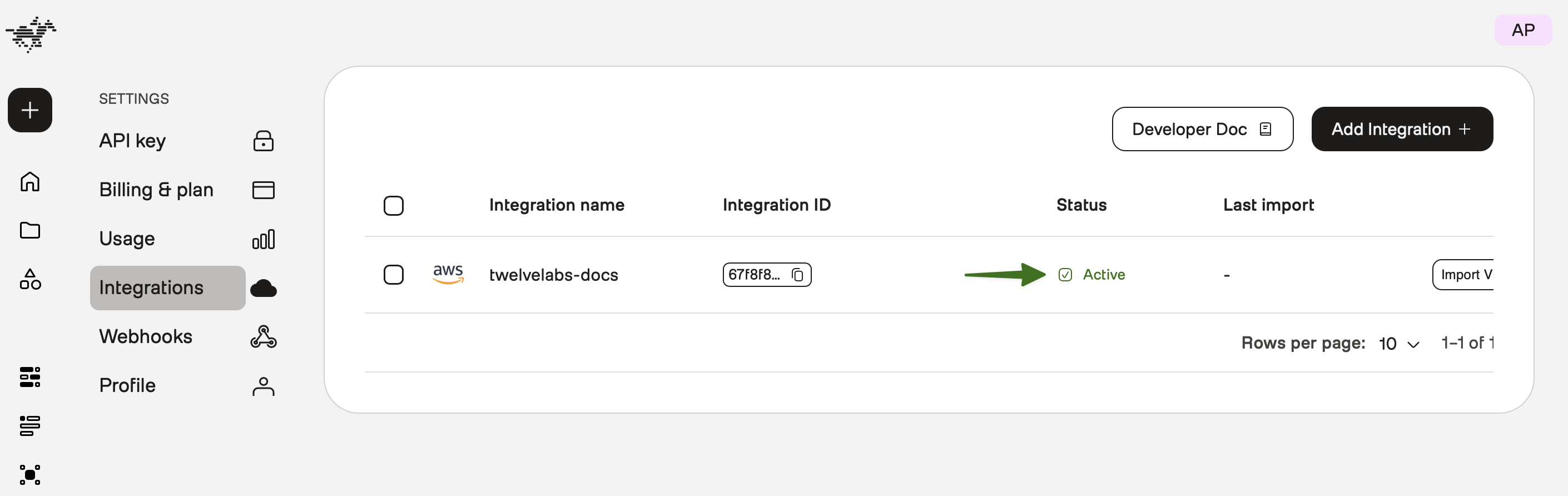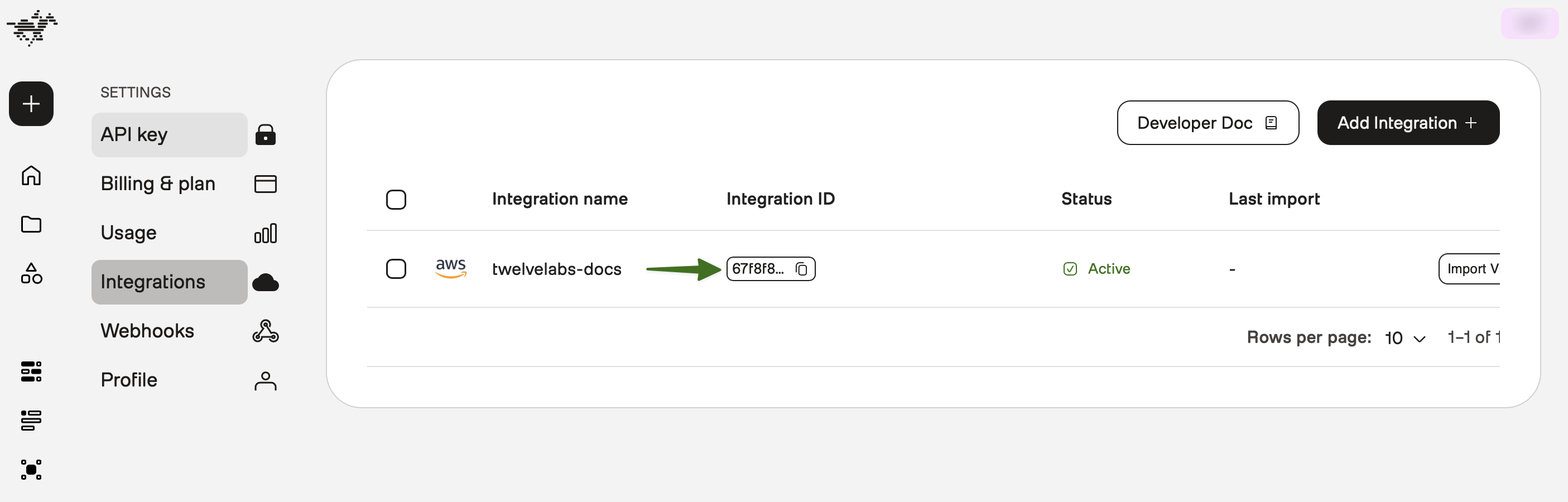 Setting up an integration grants TwelveLabs access to read files in your S3 bucket. The platform assigns a unique identifier to each integration. Before you can use this feature, you must set up an integration by following the steps in this section.