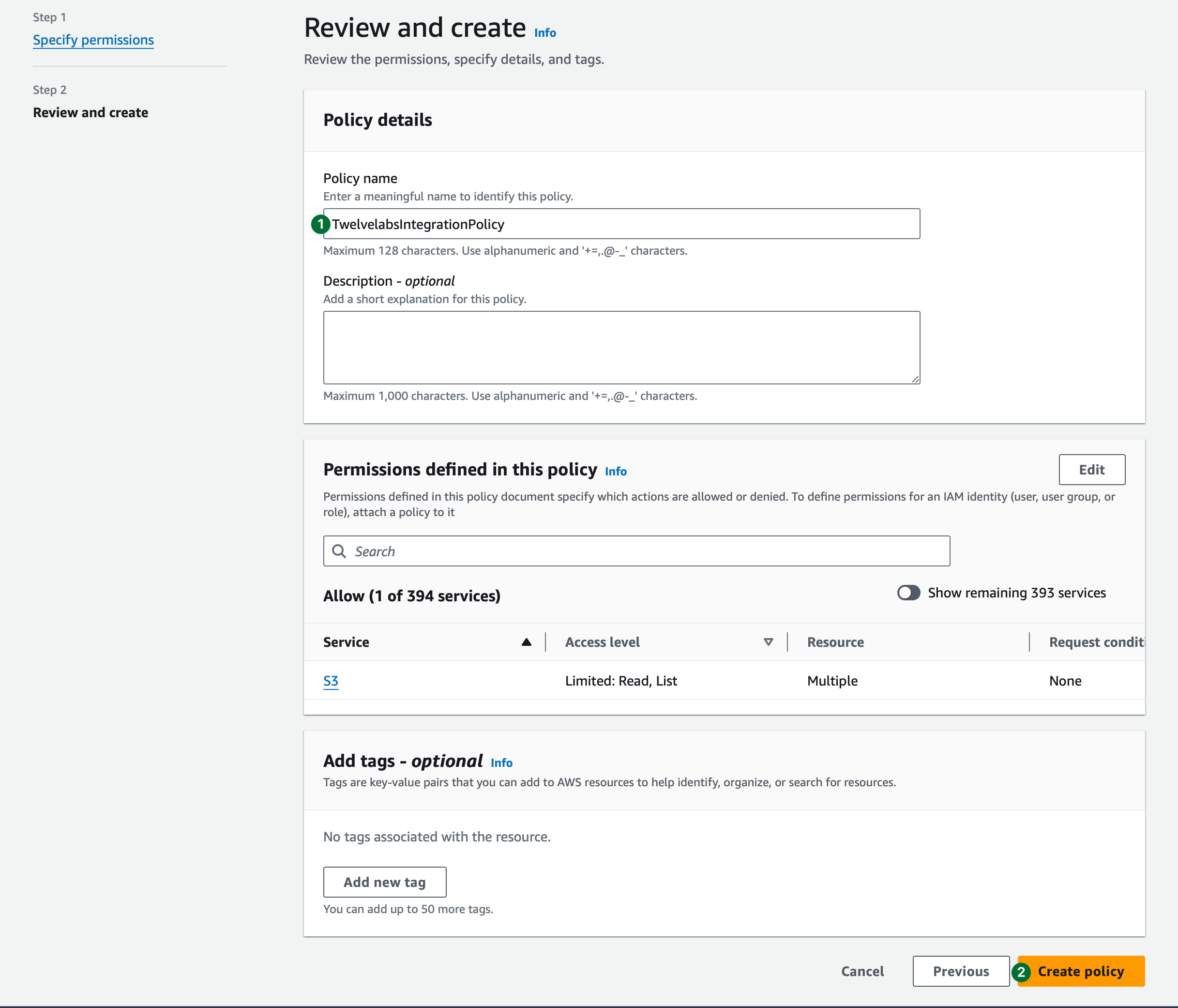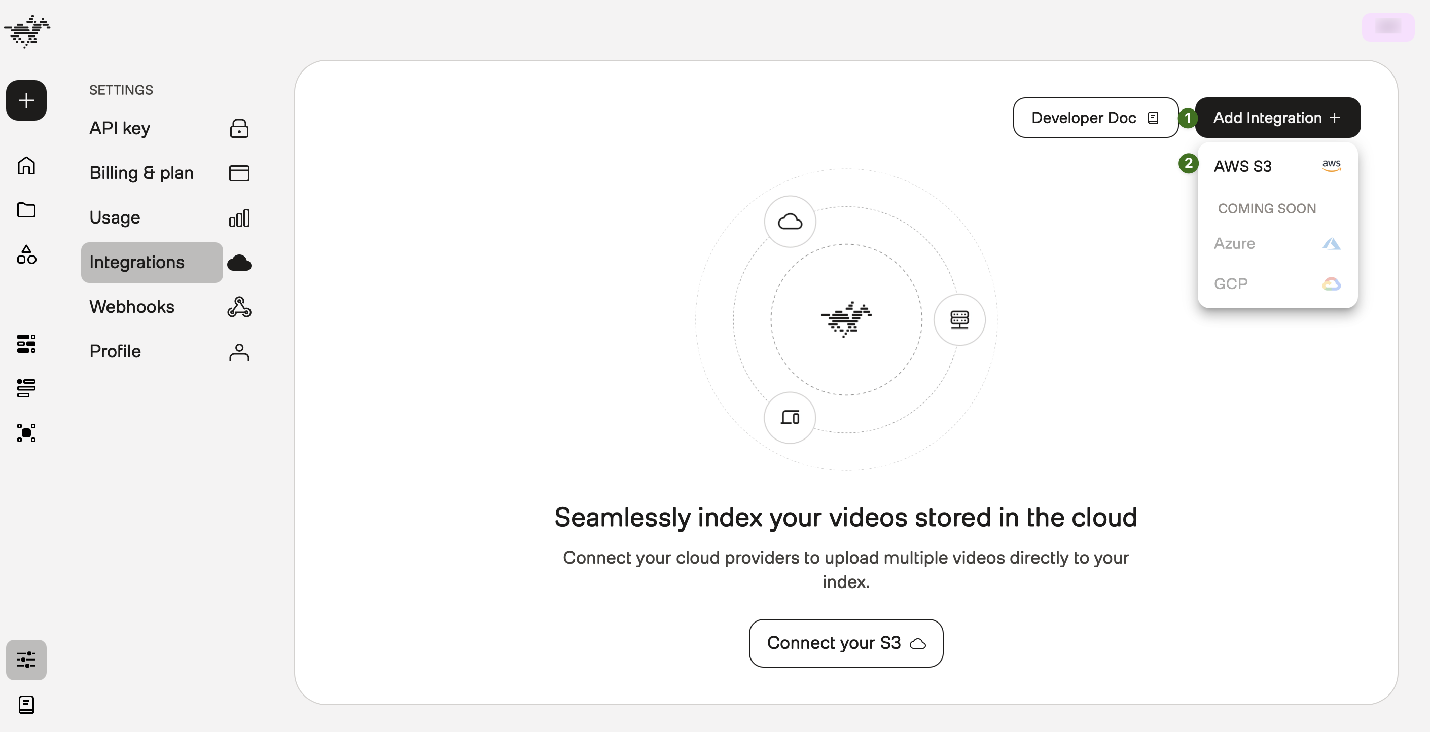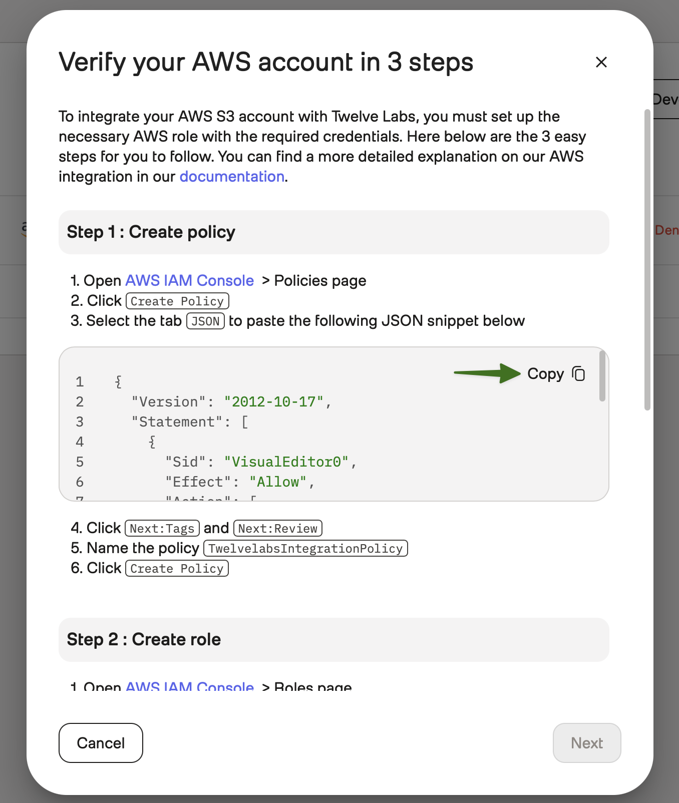 Setting up an integration grants TwelveLabs access to read files in your S3 bucket. The platform assigns a unique identifier to each integration. Before you can use this feature, you must set up an integration by following the steps in this section.