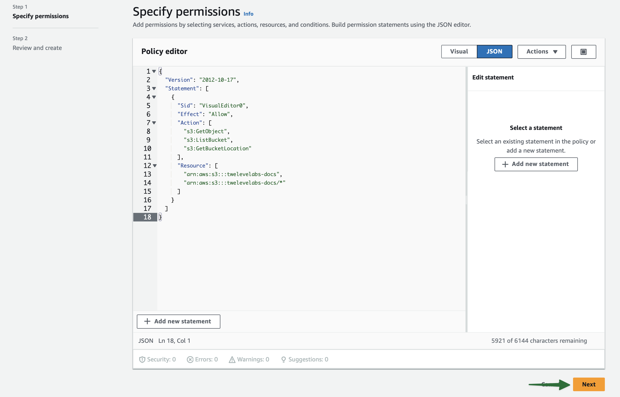 Move to the IAM Dashboard page, and replace the content of the JSON tab with the snippet you’ve copied in the previous step. Then, select the Next button: