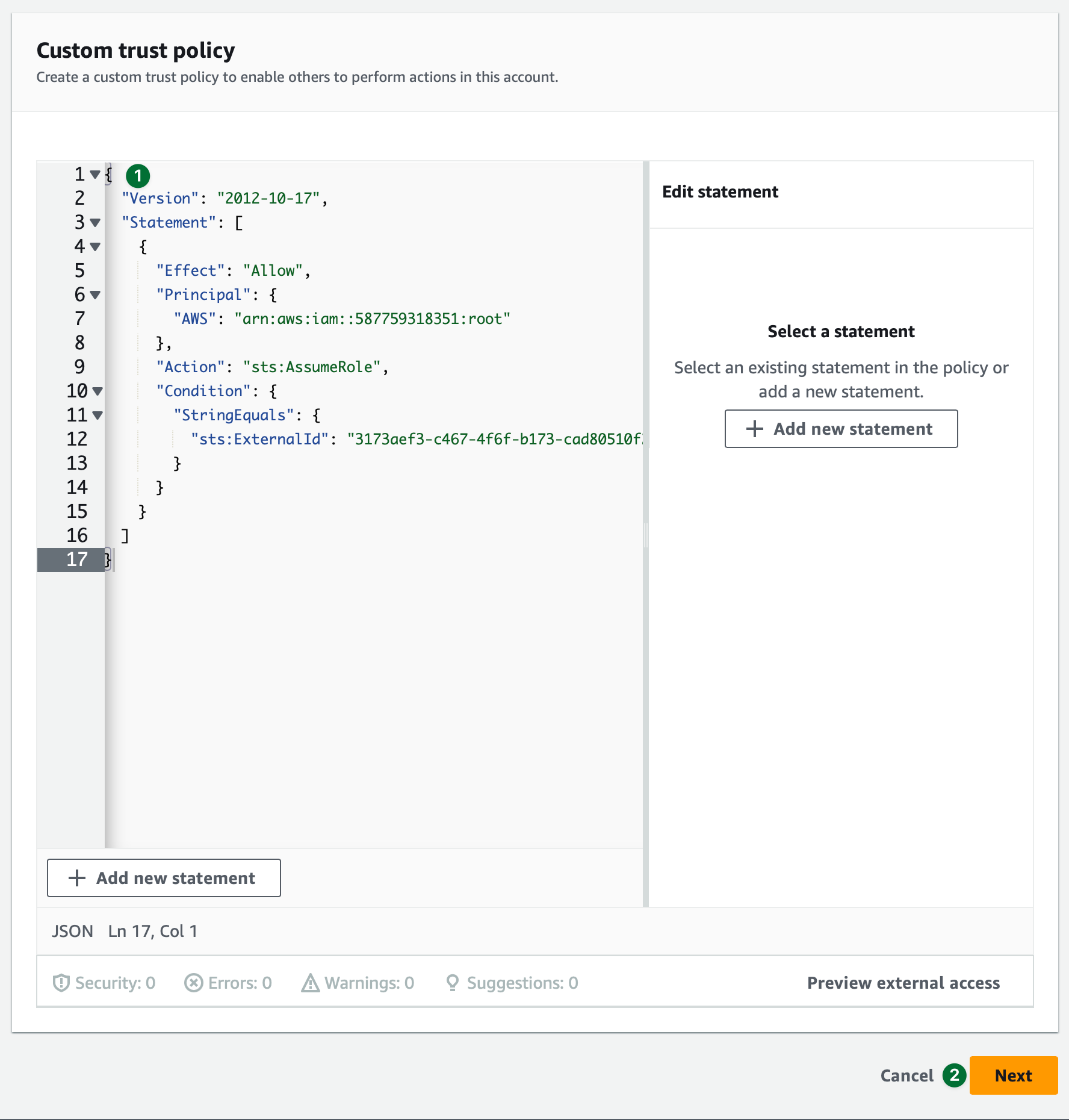 1. Move to the IAM Dashboard page, and replace the content of the Custom trust policy box with the snippet you’ve copied in the previous step. Then, select the Next button: