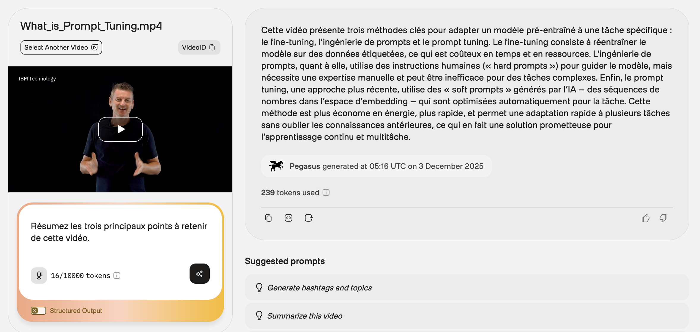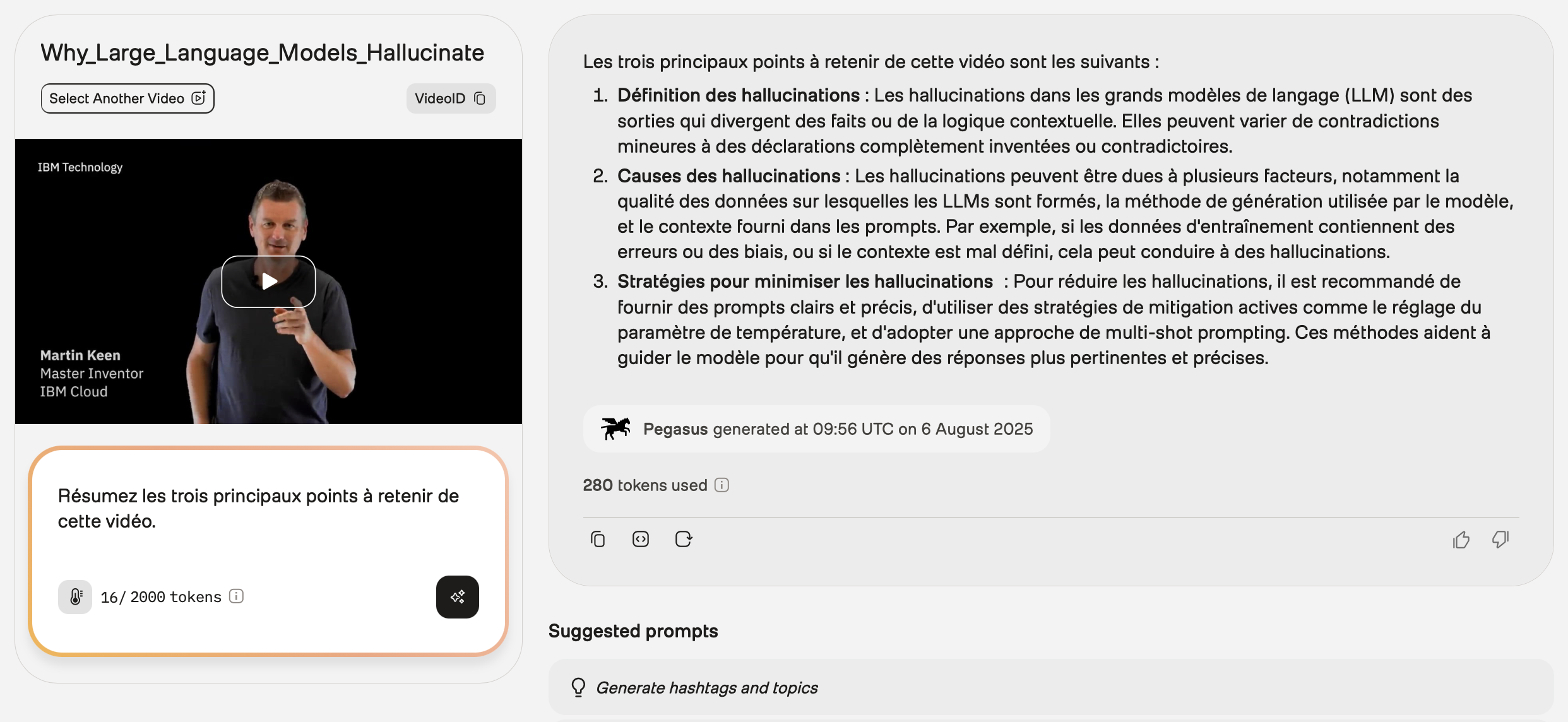 The following example summarizes the main three takeaways from this video. Note that the prompt and the output are in French.
