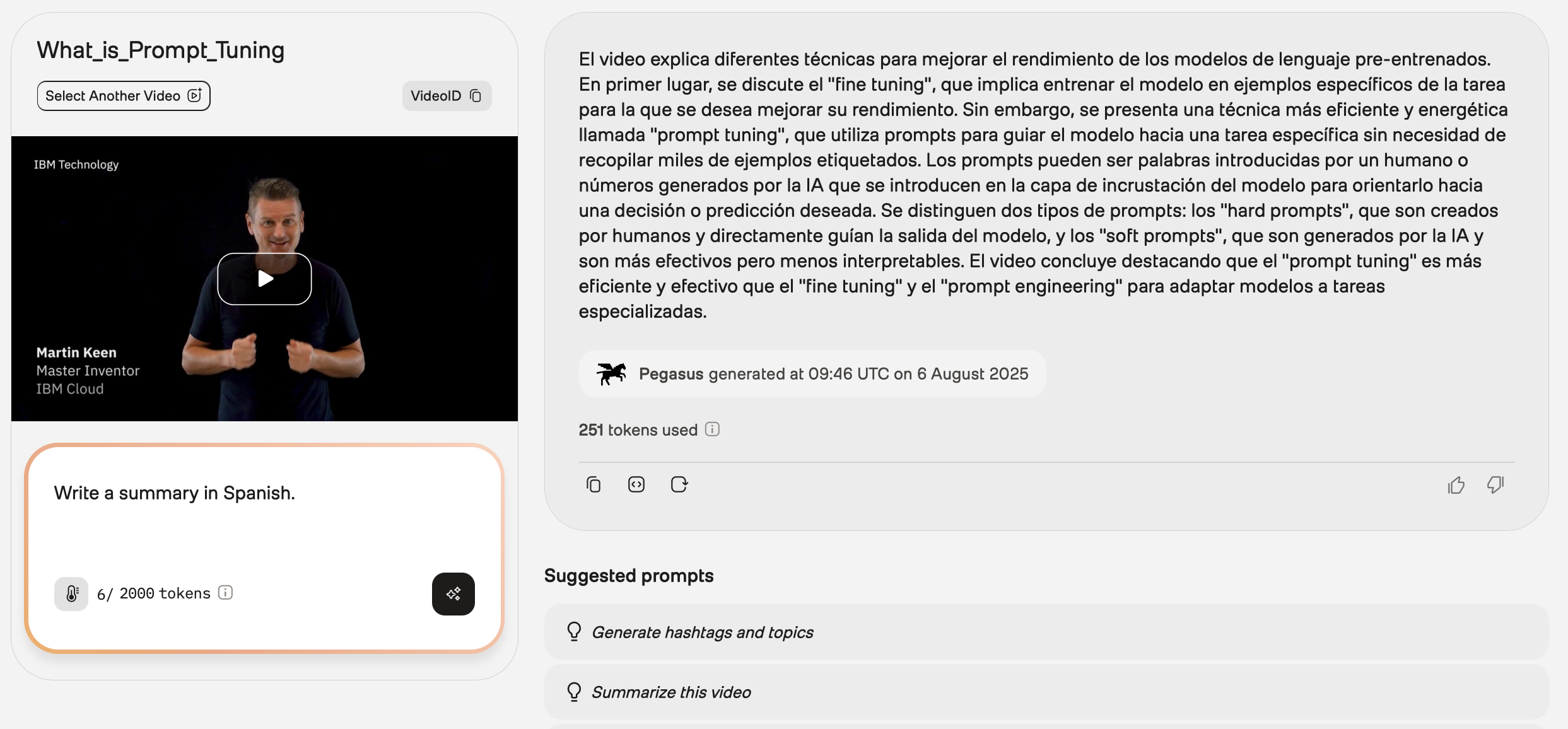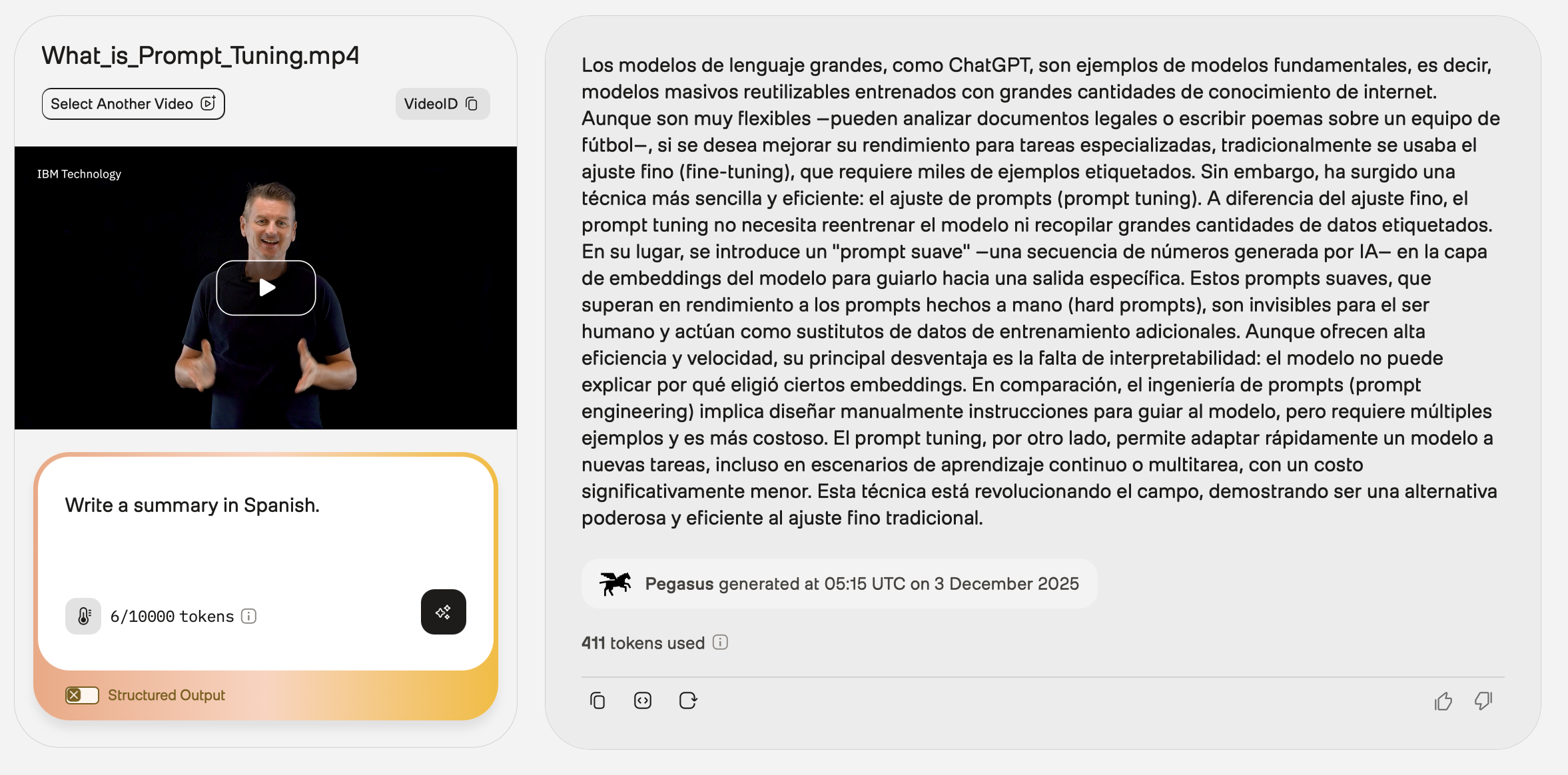 The following example summarizes a video, indicating that the response should be in Spanish. Note that the prompt is in English, and the output is in Spanish.