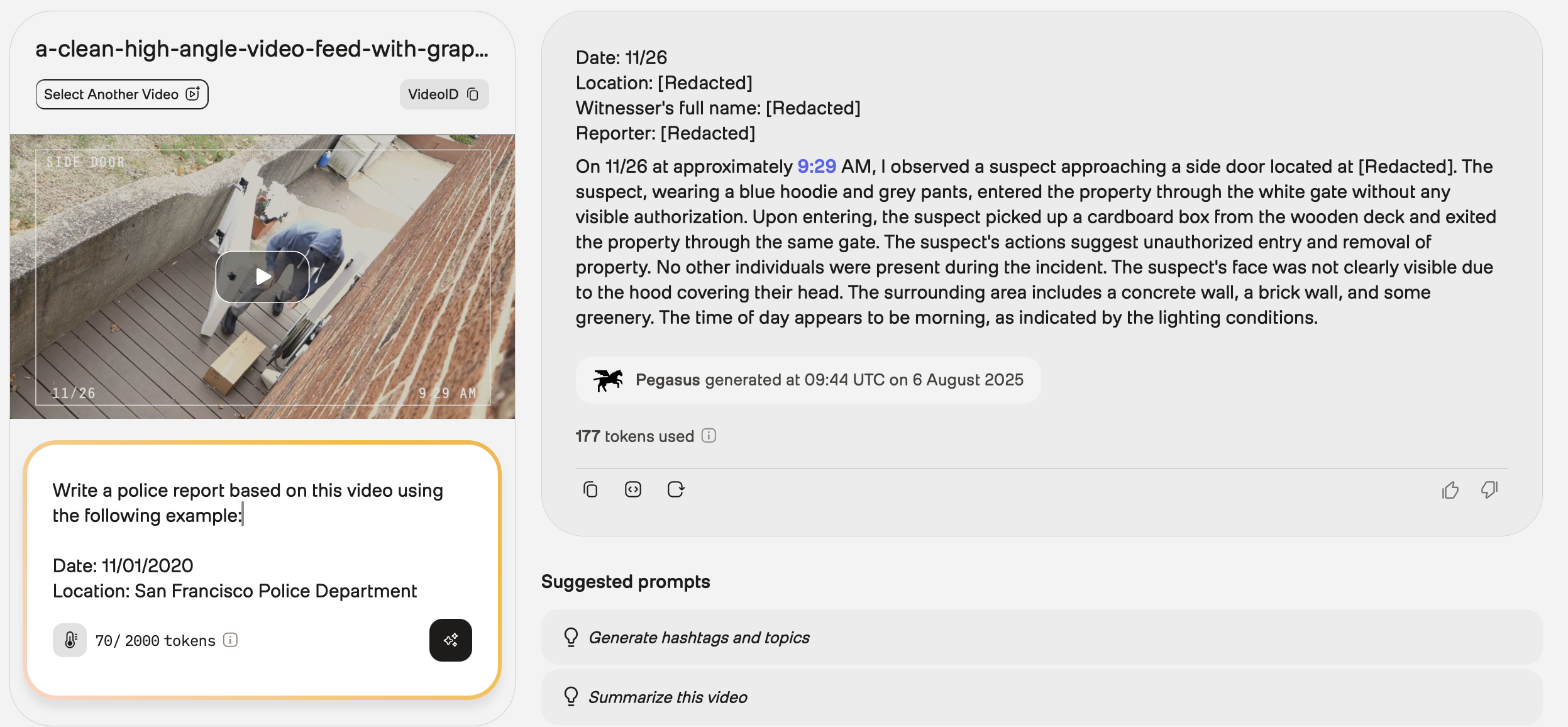 In the example screenshot below, the prompt instructs the platform to write a police report using a specific template for a video showing a robbery: