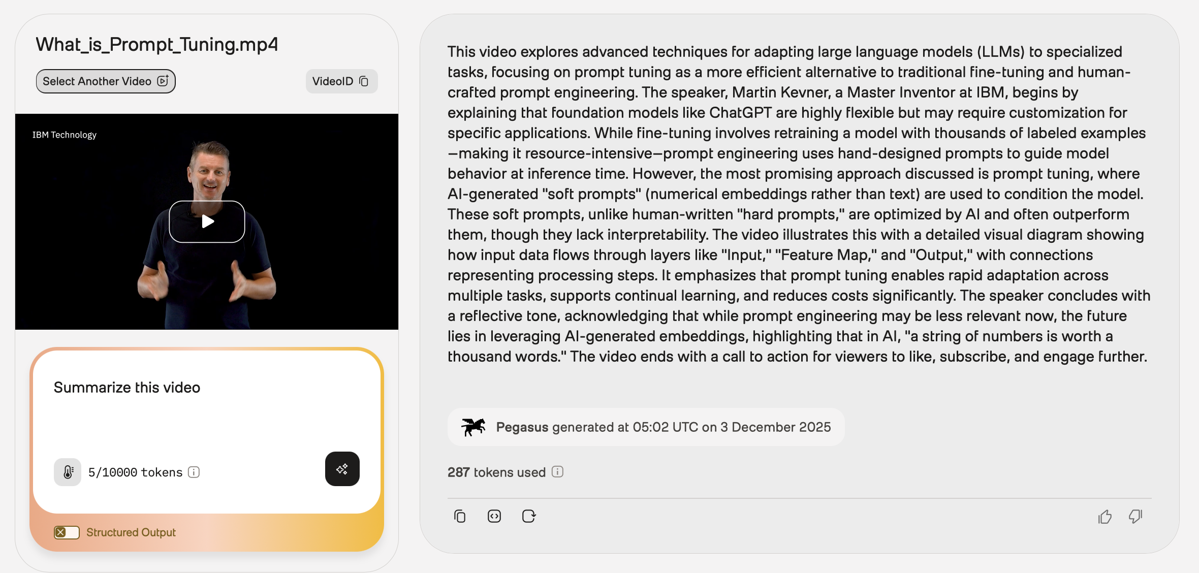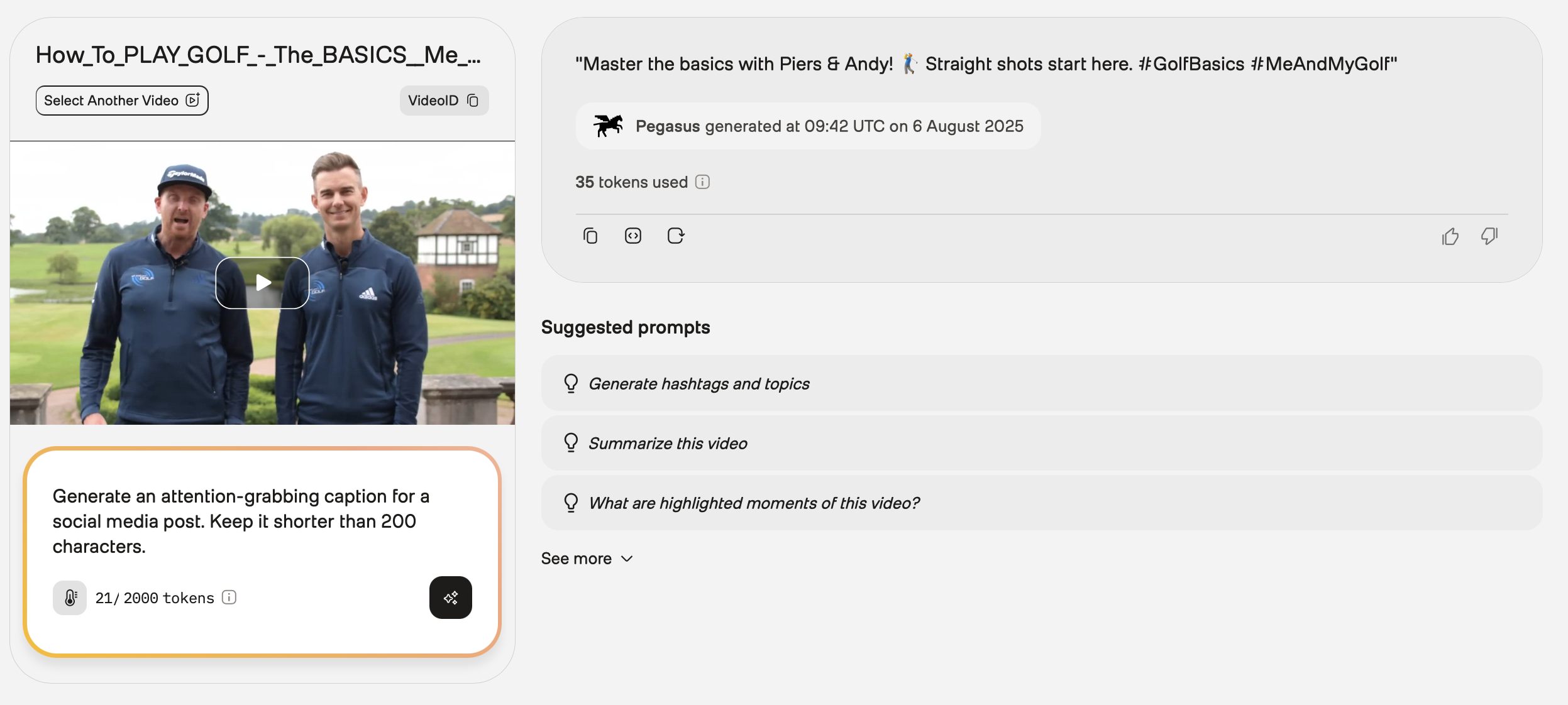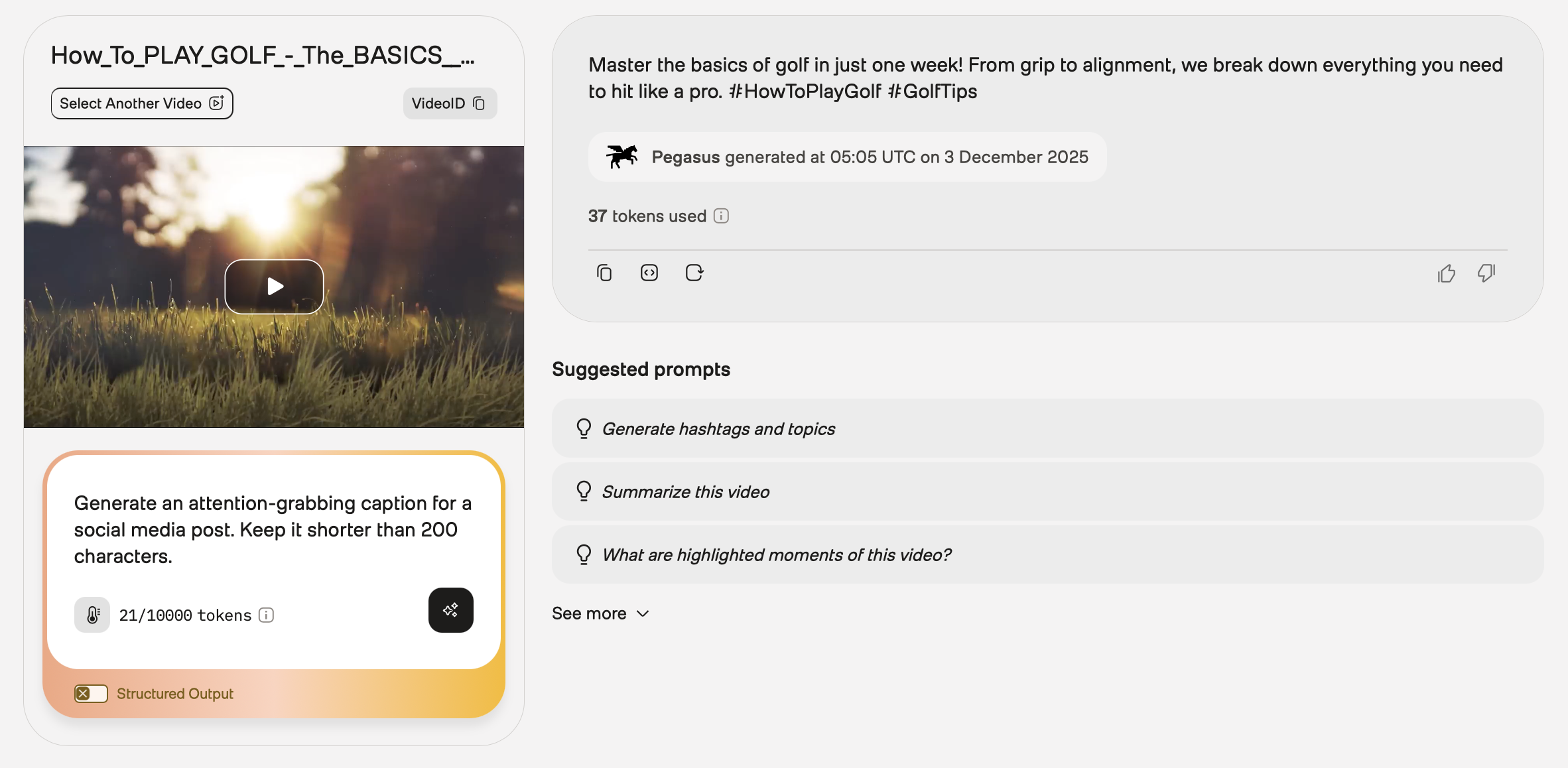Pegasus analyzes multiple modalities to generate contextually relevant text based on the content of your videos.