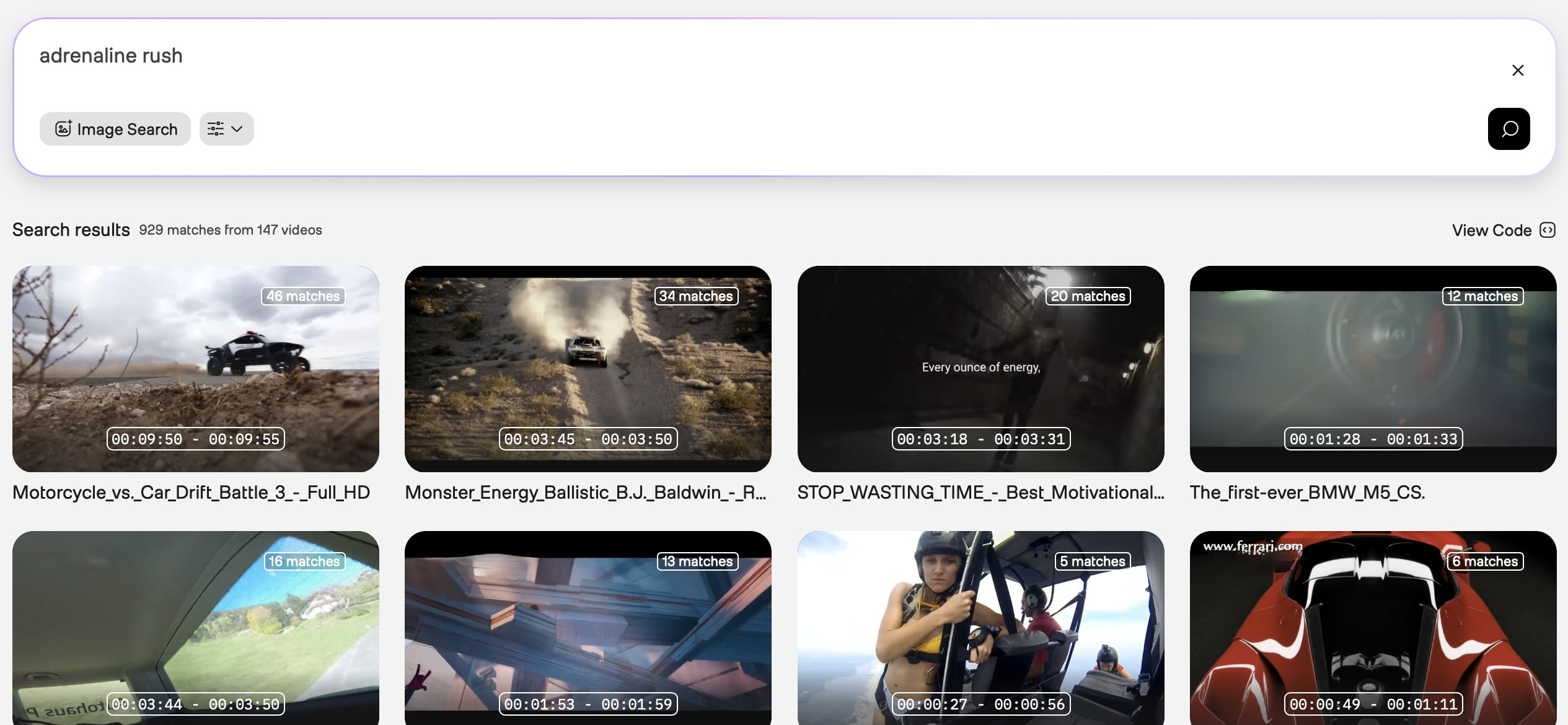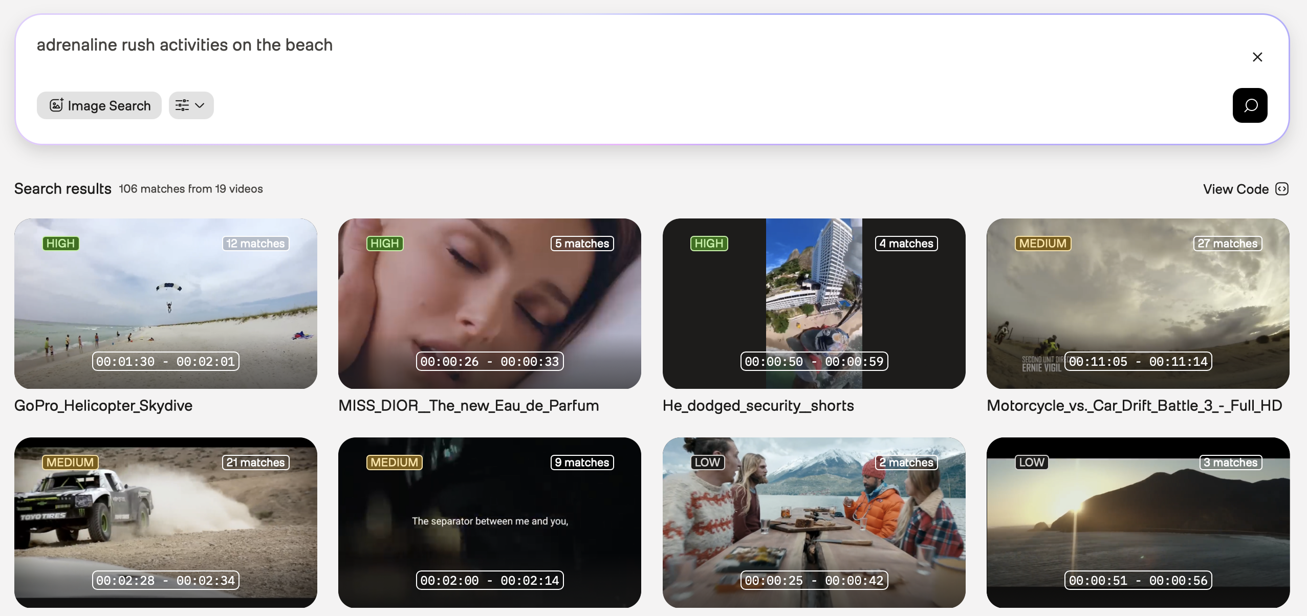 In the screenshot above, the first search result is from a video showing people skydiving from a helicopter, and you want to find more videos similar to this. To do so, you can refine your query even further by specifying both the activity and the location -