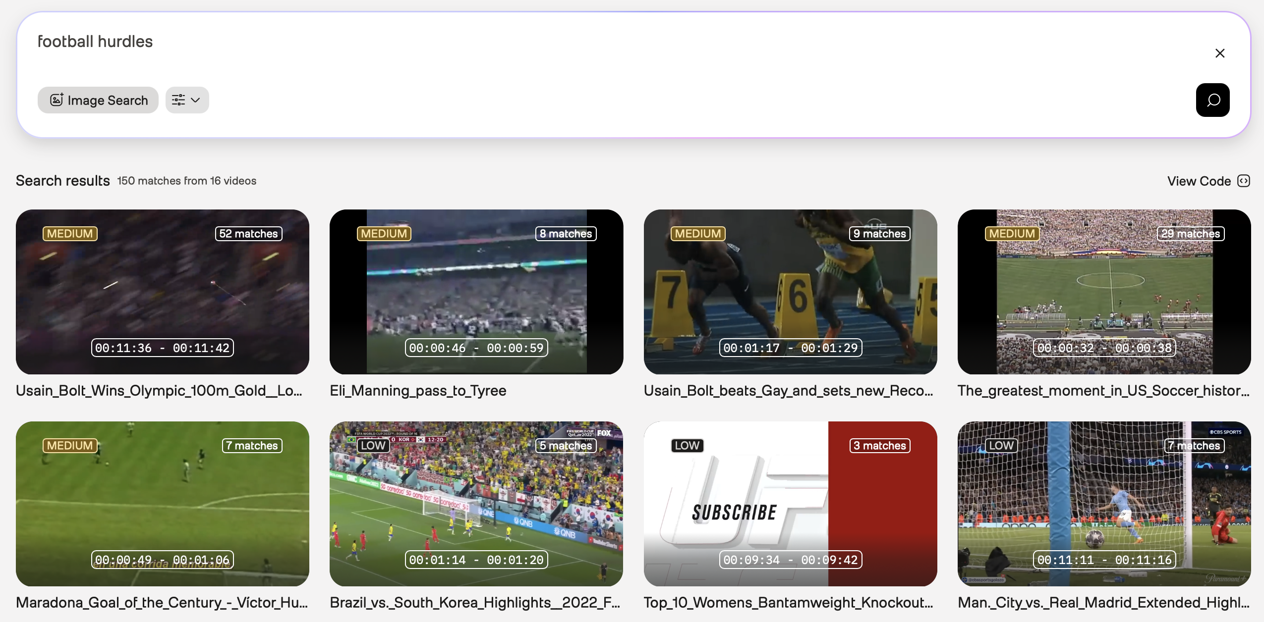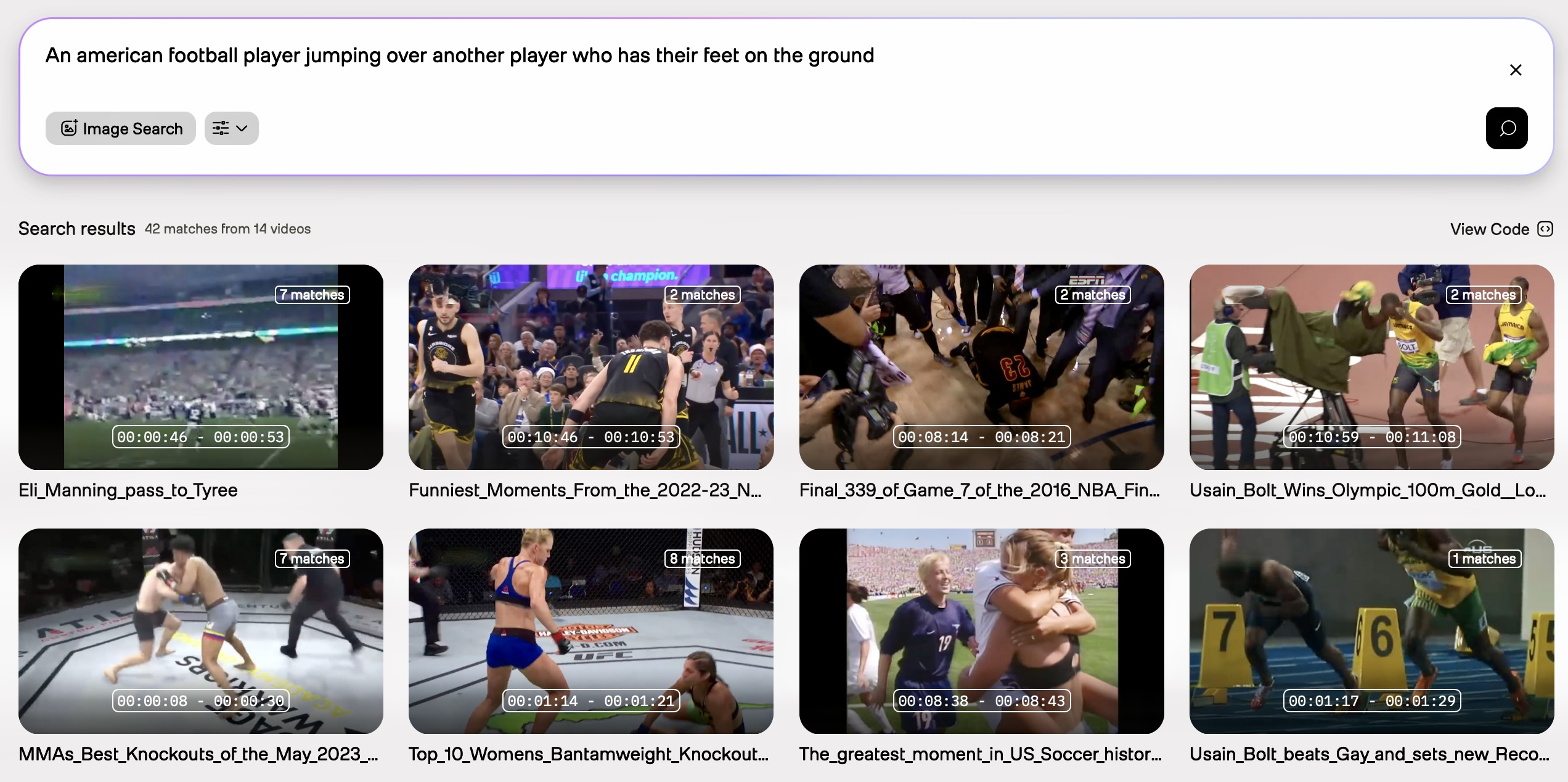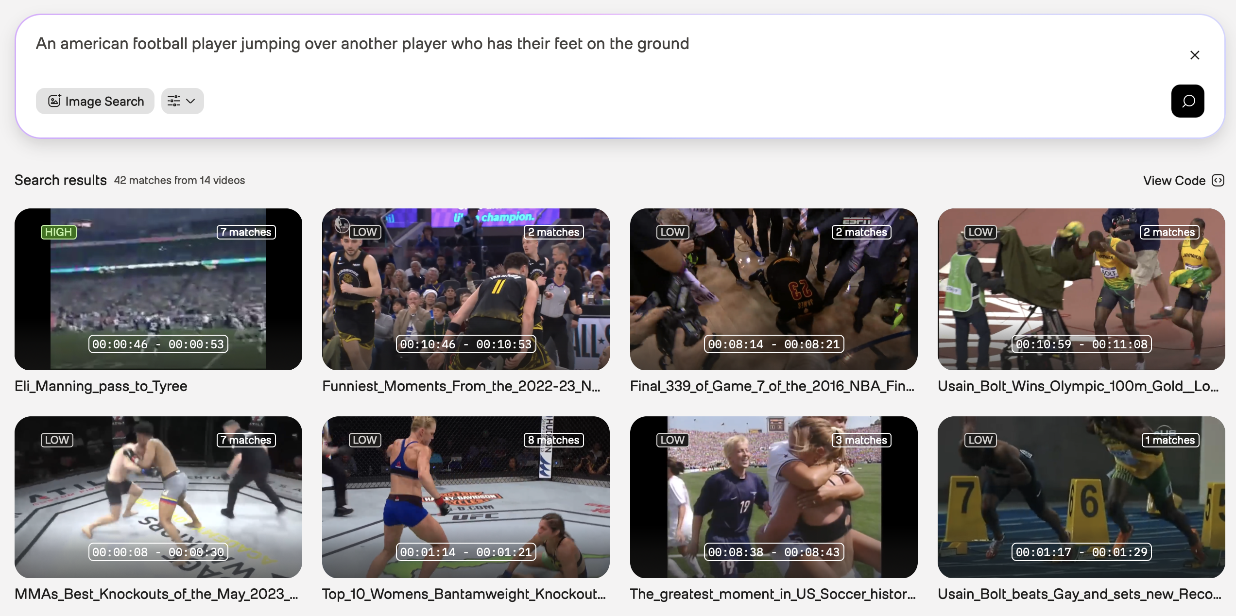 Initial query: Use football hurdles as your initial query. As shown in the screenshot below, the search results are too broad, and only a few of them show the exact moments when players hurdle over their opponents: