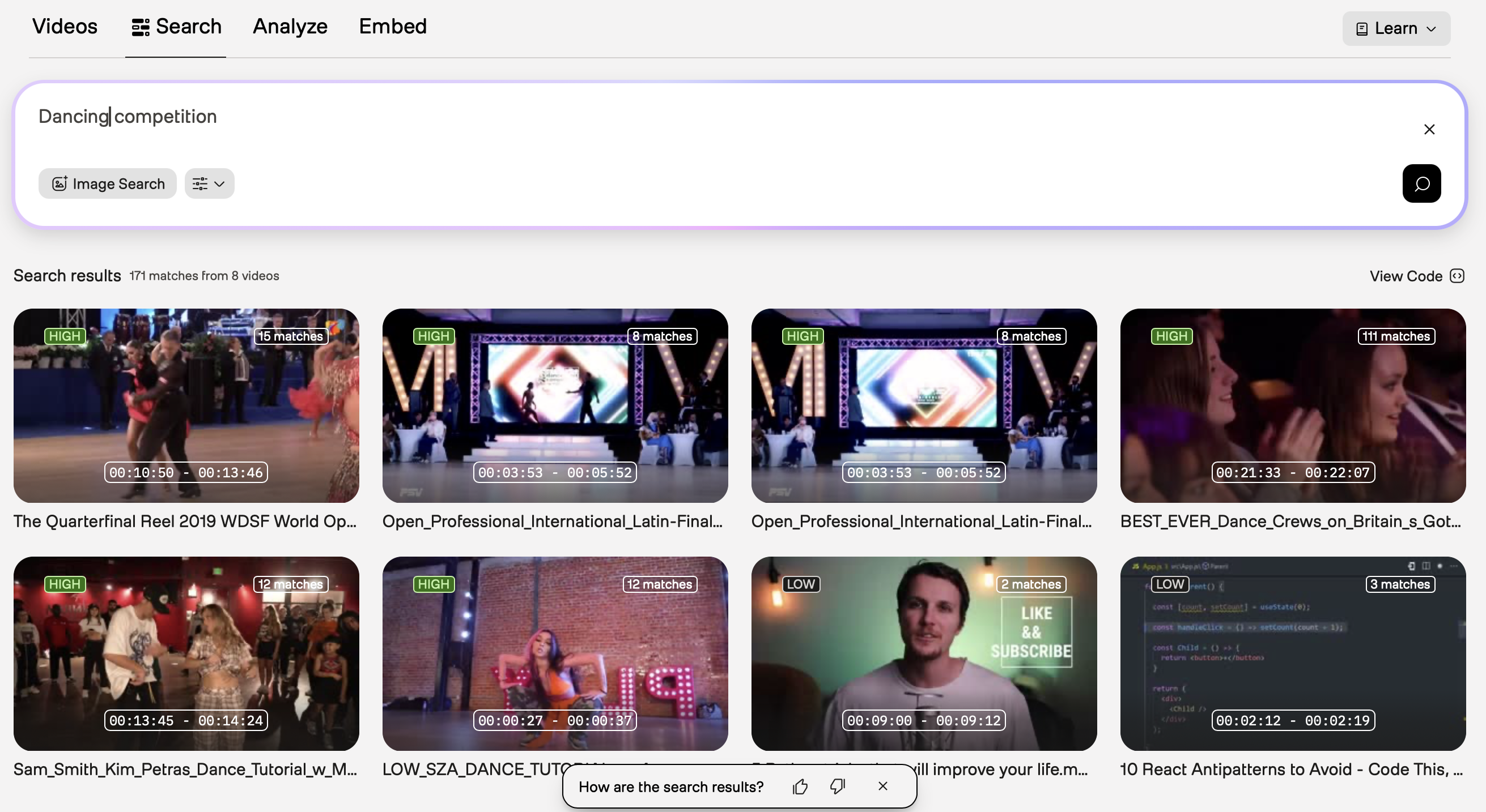 - Show confidence score: When you turn this toggle on, the Playground will also display the confidence score of each matching video fragment as a numeric value.
