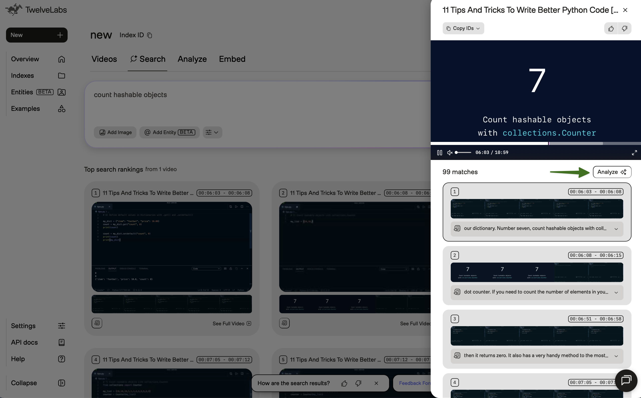 You can preview specific moments in search results, view transcriptions, see all matching clips from a video, or view the code snippet that the platform used to perform the request.