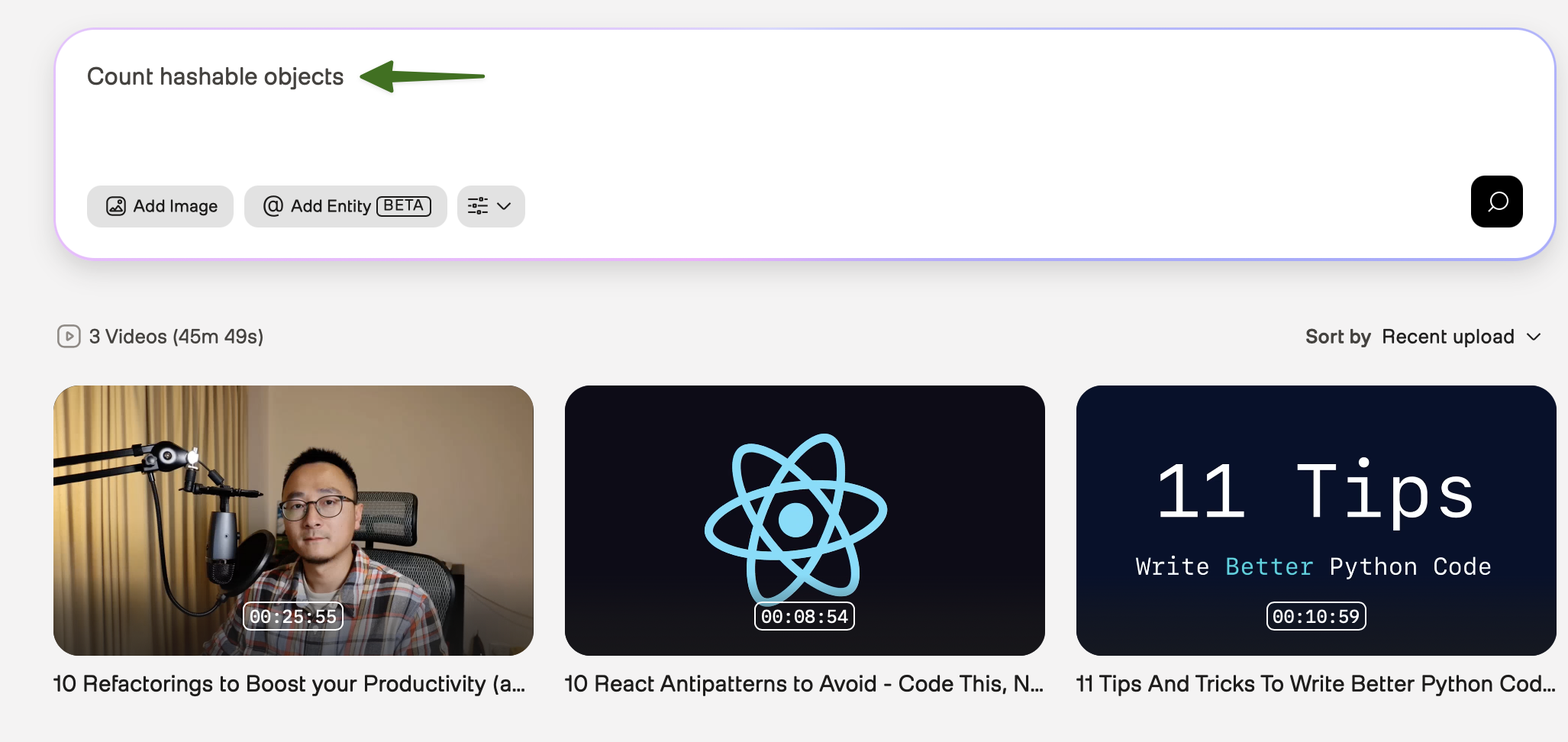 The Playground allows you to search using natural language queries. A natural language query refers to the ability to enter search requests using everyday language, instead of using specific keywords. For example, you can enter a query like “Interviews with scientists discussing climate change.” The platform analyzes the query, identifies the key elements, and searches for video clips that match it. Then, the Playground shows the relevant moments from your videos that match the query you entered, making the search process intuitive and user-friendly.