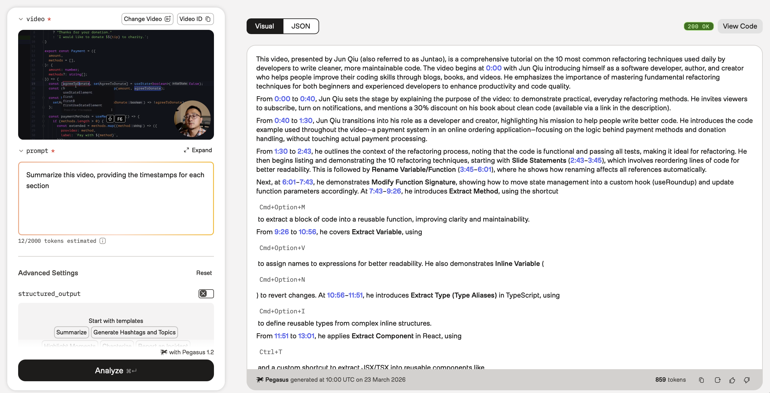 - This feature is available only for indexes with the Pegasus video understanding engine enabled. See the Create an index section for details.