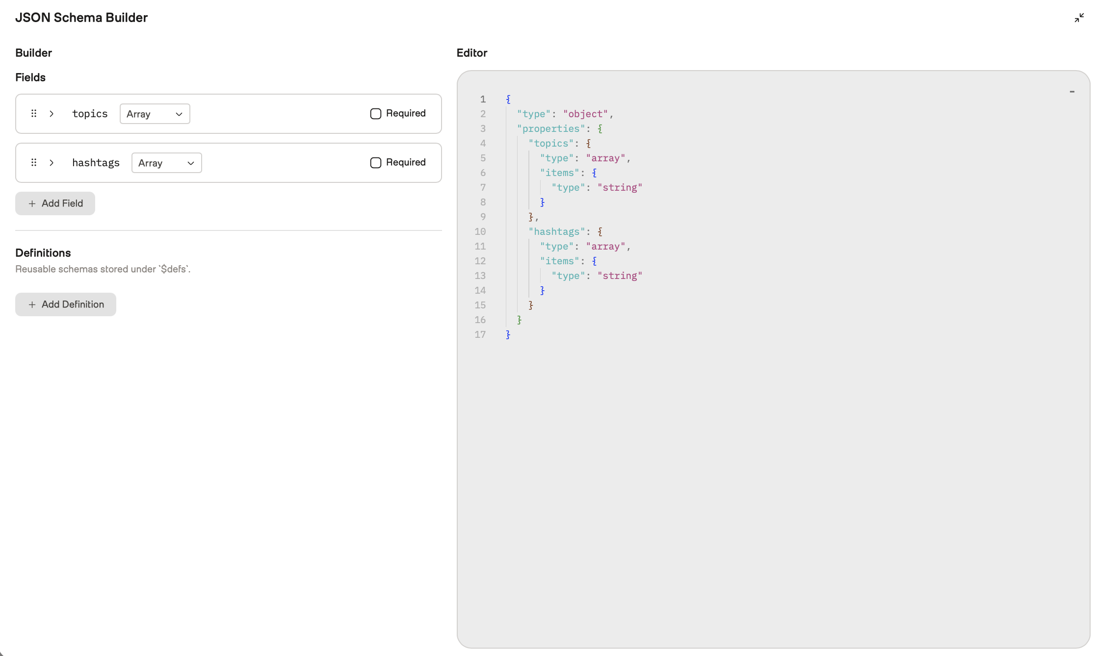 If you enable the toggle, the Builder panel opens immediately. Define your schema in the Builder panel (visual interface) or the Editor panel (raw JSON). Changes in either panel reflect immediately in the other.