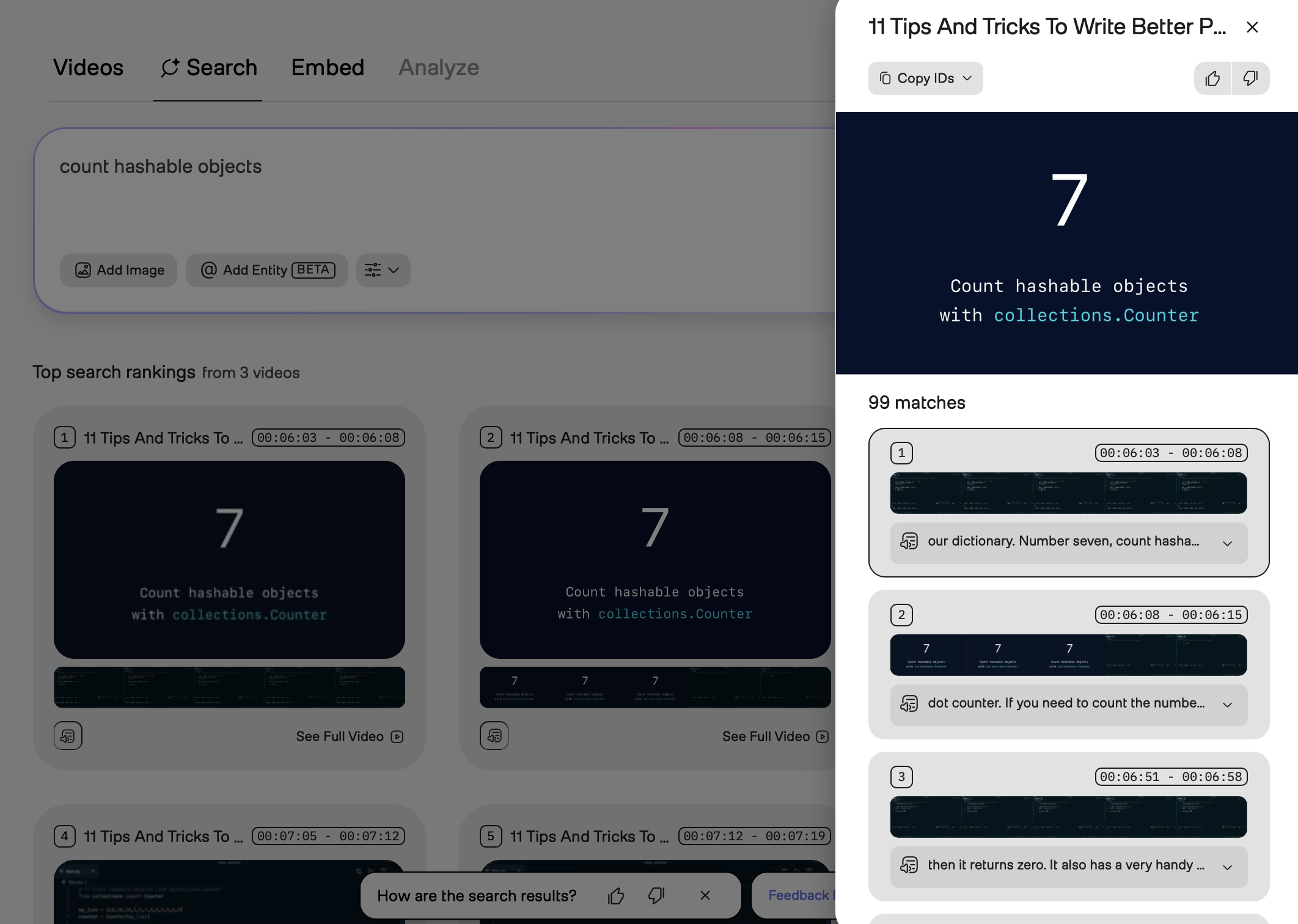 You can preview specific moments in search results, view transcriptions, see all matching clips from a video, or view the code snippet that the platform used to perform the request.