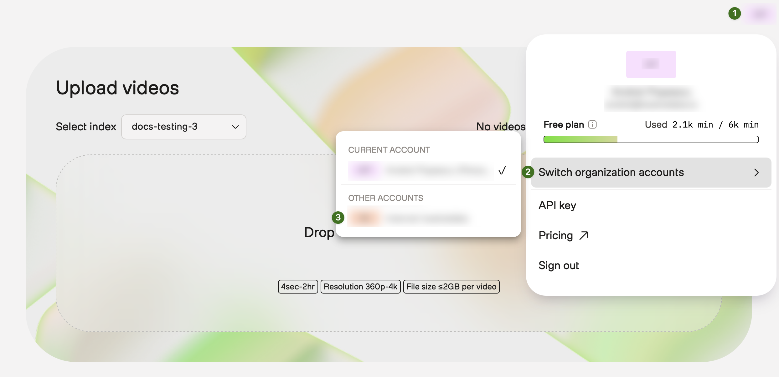All shared resources (indexes, videos, and S3 integrations) work exactly like those in your personal account but are automatically shared with all organization members. You can create, manage, and use these resources using the same workflows you’re familiar with from your personal account.