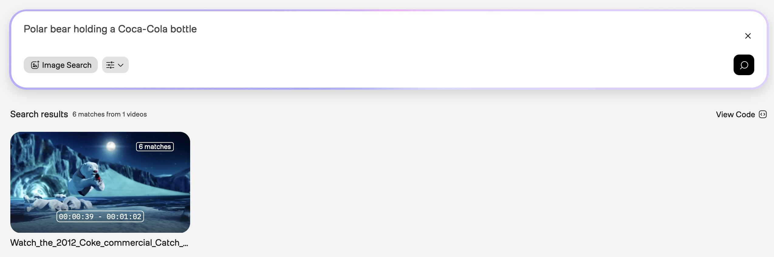 In the example screenshot below, the query was “Polar bear holding a Coca-Cola bottle.” The Marengo video understanding model used information found in the visual and logo modalities to perform the following tasks: