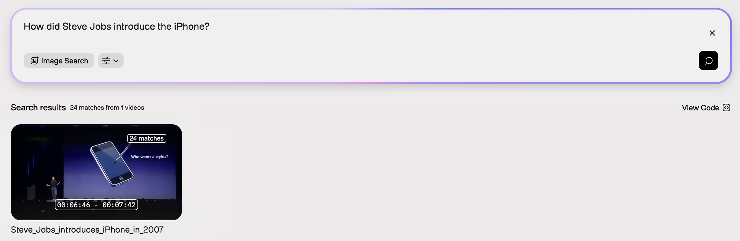 In the example screenshot below, the query was “How did Steve Jobs introduce the iPhone?”. The Marengo video understanding model used information found in the visual and conversation audio to perform the following tasks: