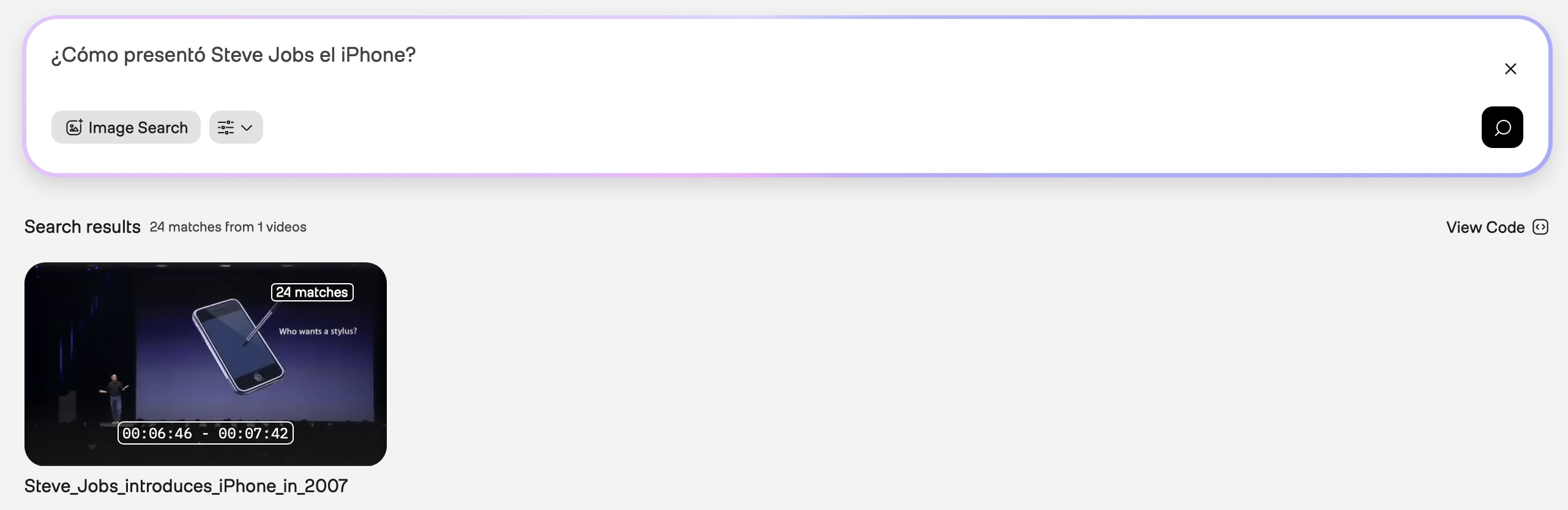 In the example screenshot below, the query was “¿Cómo presentó Steve Jobs el iPhone?” (“How did Steve Jobs introduce the iPhone?”). The Marengo video understanding model used information from the visual and audio modalities.