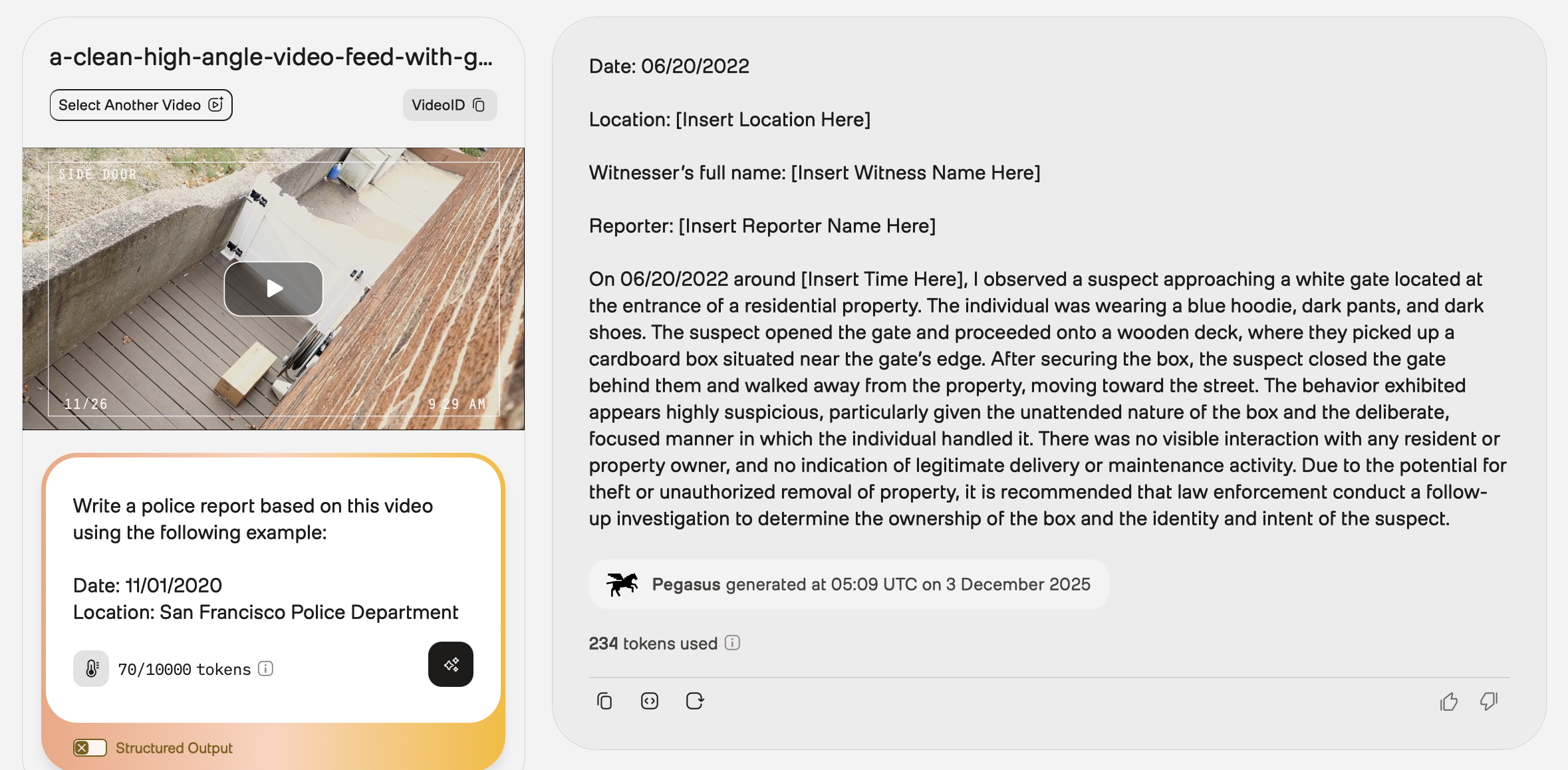 In the example screenshot below, the prompt instructs the platform to write a police report using a specific template for a video showing a robbery: