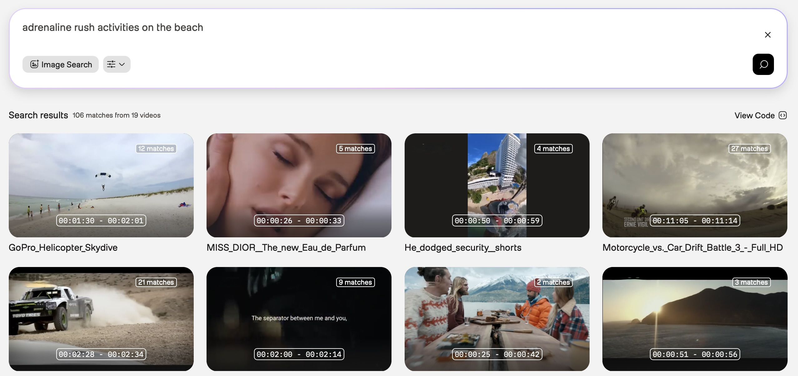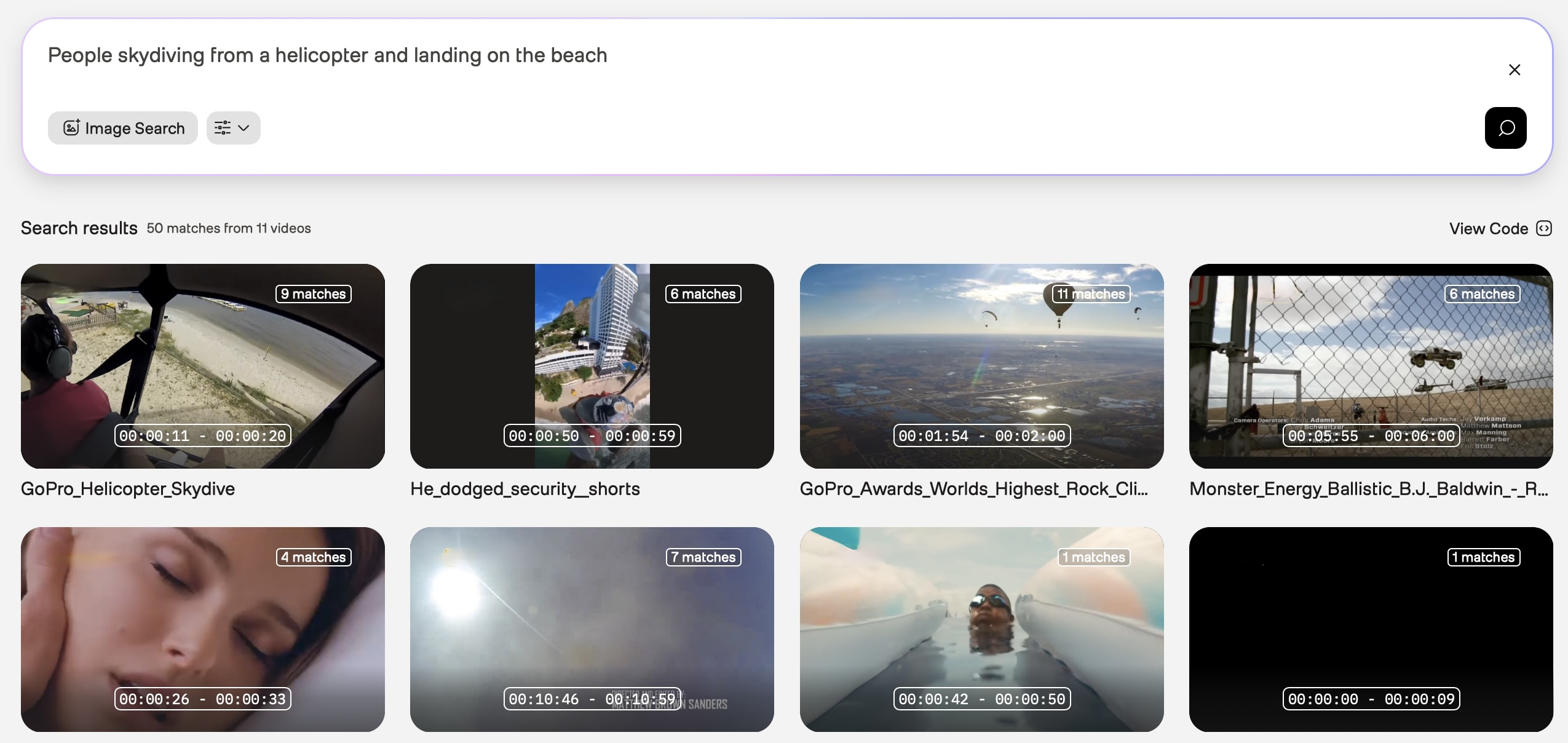 In the screenshot above, the first search result is from a video showing people skydiving from a helicopter, and you want to find more videos similar to this. To do so, you can refine your query even further by specifying both the activity and the location -