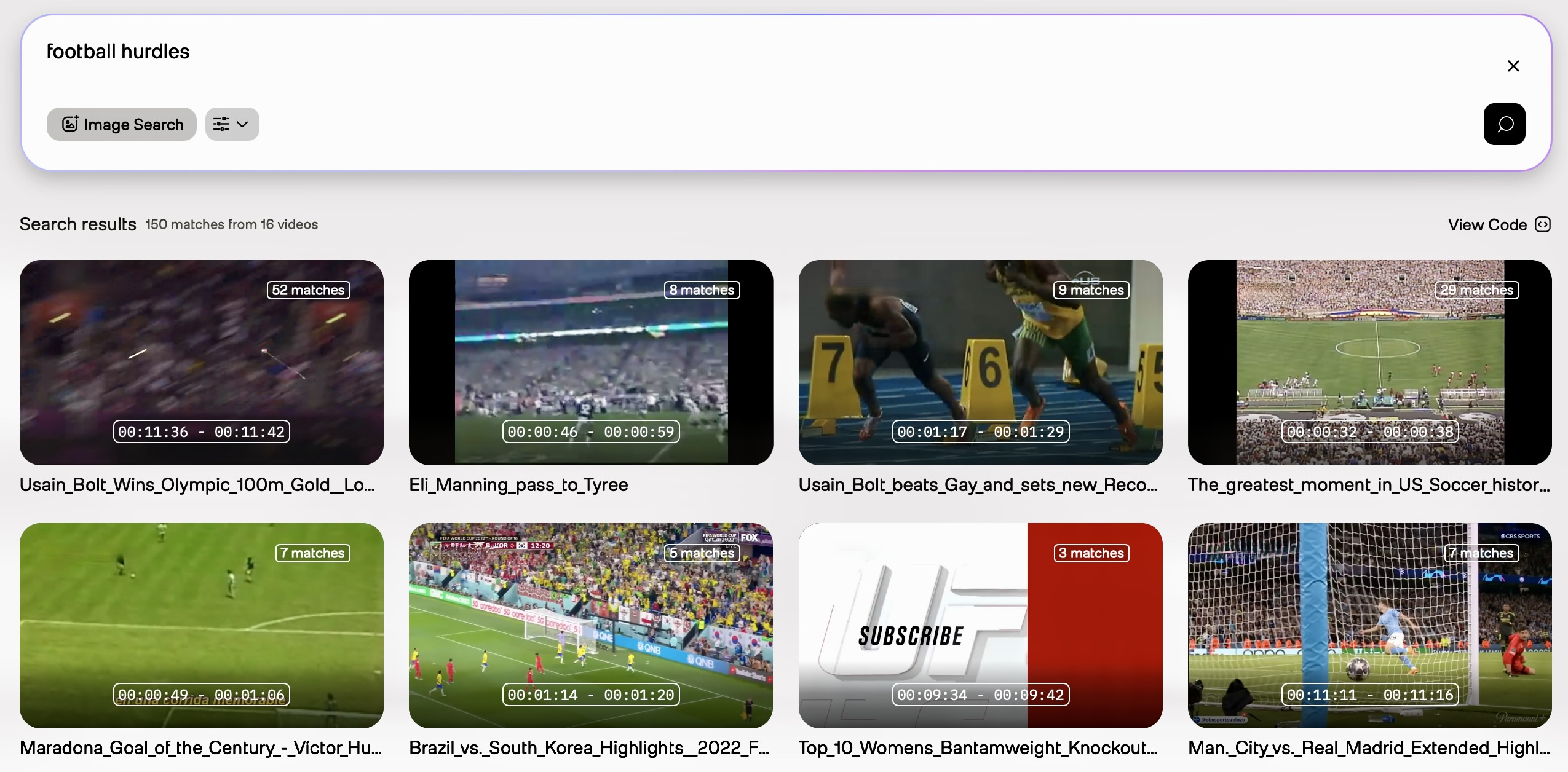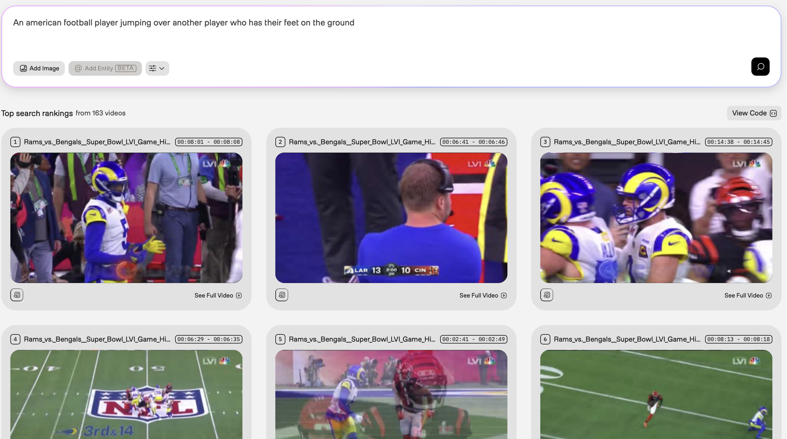 Initial query: Use football hurdles as your initial query. As shown in the screenshot below, the search results are too broad, and only a few of them show the exact moments when players hurdle over their opponents: